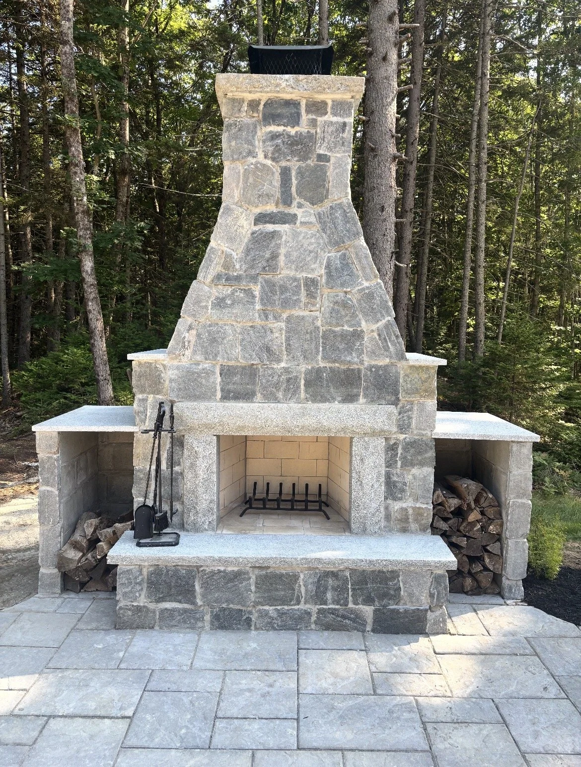 Wood-burning outdoor fireplace with chimney and wood boxes constructed with Getty Grey Stone from Thompson stone, and built in Freeport Maine