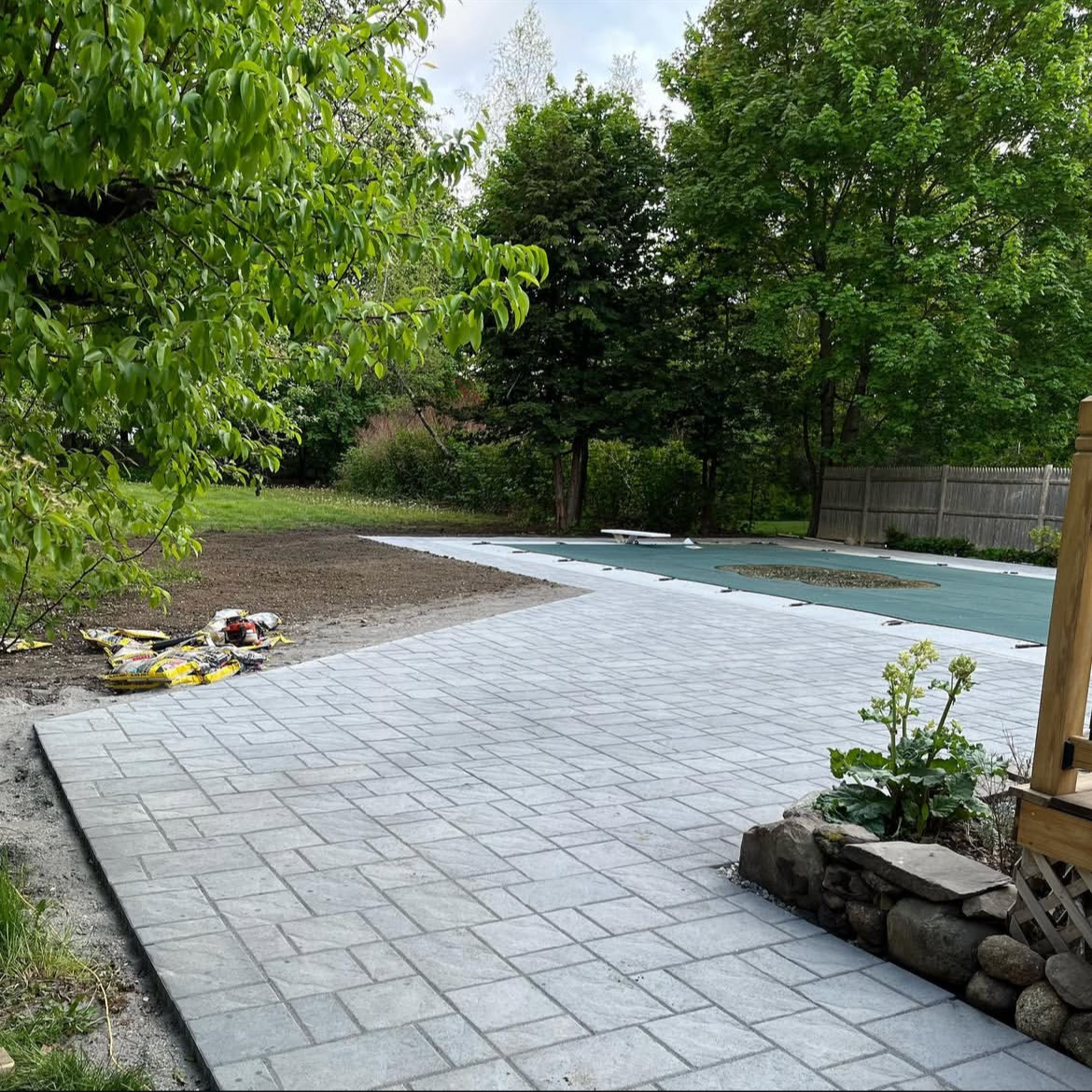 Paver pool patio installation in Gorham ME with cottage ledge stone from Gagne & Sons